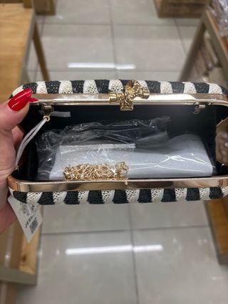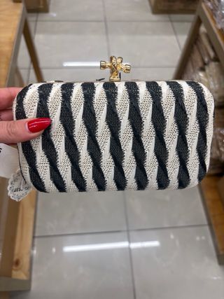 Elegante pochette con un design a righe. - Fantasia a zig-zag. - Chiusura a scatto dorata. - Tessuto intrecciato.