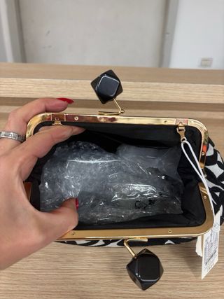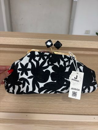 Elegante pochette con un bellissimo ricamo floreale. - Design a contrasto bianco e nero. - Chiusura a scatto con dettagli geometrici. - Marchio Jessica.