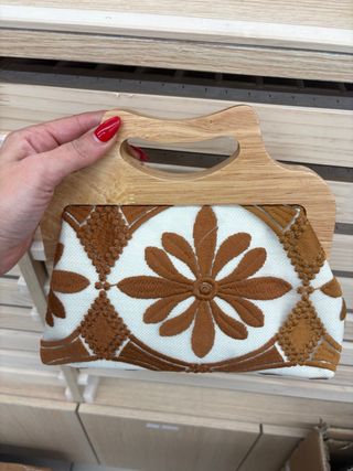 Elegante pochette con un design unico. - Manico superiore in legno naturale. - Tessuto bianco con ricamo floreale marrone. - Motivo geometrico e floreale.