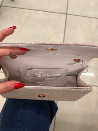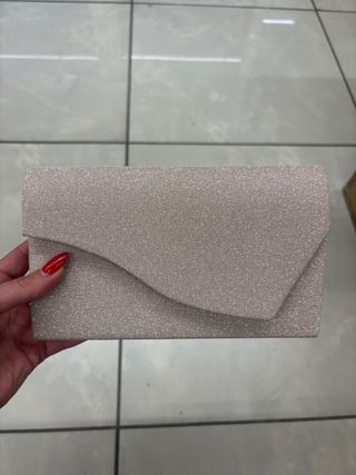 Elegante pochette con finitura glitterata, perfetta per completare un look. - Colore beige con riflessi dorati. - Design a busta con chiusura a patta. - Materiale testurizzato scintillante.