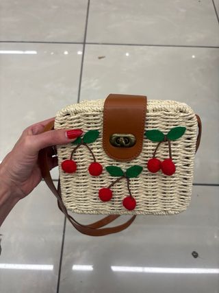 Graziosa pochette in paglia decorata con applicazioni a forma di ciliegie rosse e foglie verdi. - Chiusura con fibbia. - Tracolla in ecopelle marrone. - Design unico e divertente.