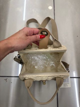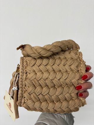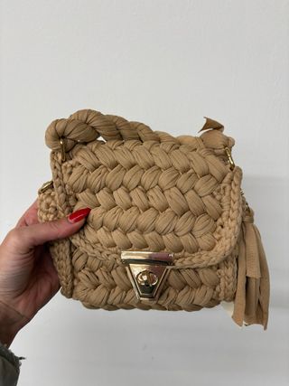 Elegante borsetta da donna, perfetta per completare ogni outfit. - Materiale intrecciato color beige. - Dettagli metallici color oro. - Chiusura a scatto. - Pompon decorativo laterale.