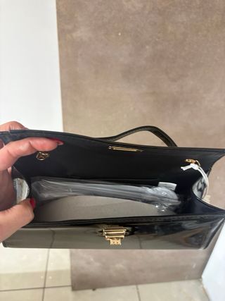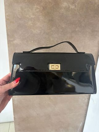 Elegante pochette nera con finitura lucida. - Materiale verniciato. - Chiusura a scatto dorata. - Manico superiore.