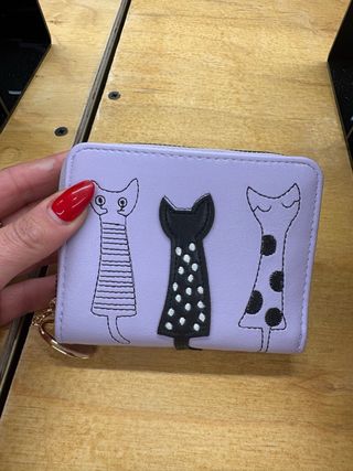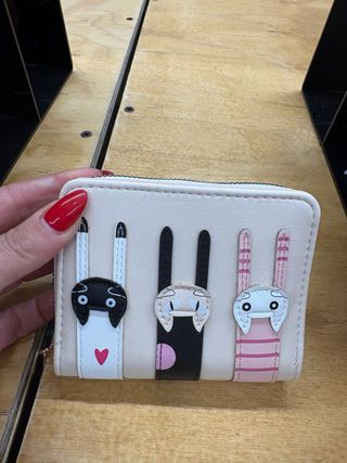 Portafoglio da donna con un simpatico design. - Motivo a tre gattini stilizzati. - Chiusura con zip. - Dettaglio portachiavi dorato.