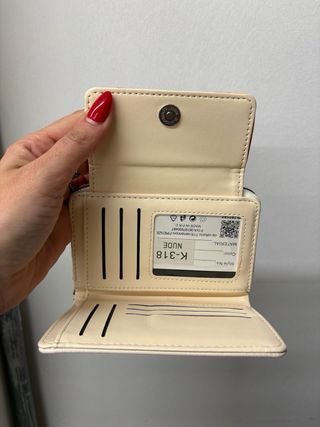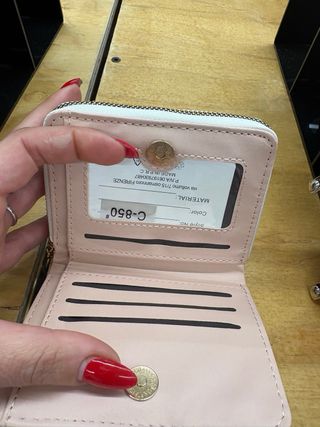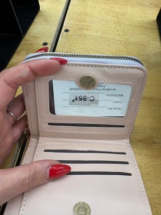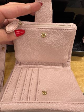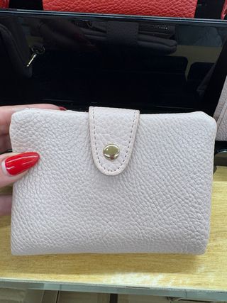 Elegante portafoglio da donna con una texture a grana fine. Presenta una chiusura a bottone a pressione dorata. - Materiale: similpelle - Colore: rosa cipria - Chiusura: bottone a pressione