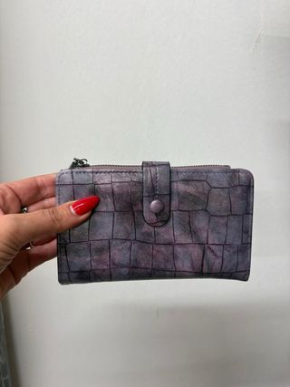 Portafoglio da donna con un design elegante. - Texture effetto coccodrillo. - Chiusura con bottone a pressione. - Dettagli metallici. - Tasca esterna con zip.