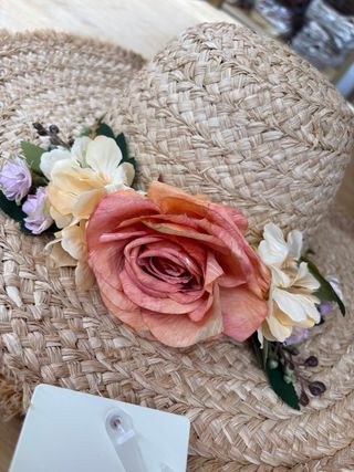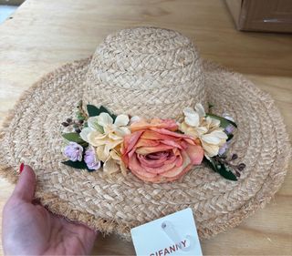 Elegante cappello di paglia da donna, perfetto per completare il tuo look estivo. Decorato con un grazioso bouquet di fiori. - Materiale: paglia intrecciata - Decorazione floreale applicata - Bordo sfrangiato