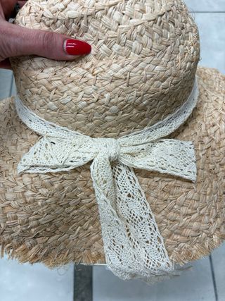 Elegante cappello da donna in paglia, perfetto per le giornate di sole. Presenta un nastro in pizzo decorativo. - Materiale: paglia intrecciata - Dettaglio: nastro in pizzo con fiocco - Bordo sfrangiato