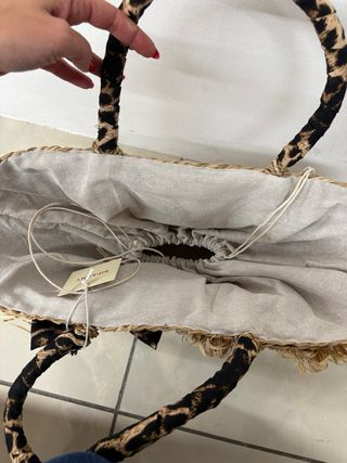 Borsa da mare in paglia, perfetta per l'estate. Presenta dettagli unici che la rendono speciale. - Decorata con fiori applicati. - Fiocco con stampa leopardata. - Manici rivestiti in tessuto leopardato. - Dettagli in rafia.