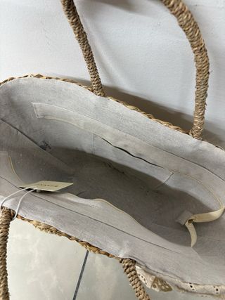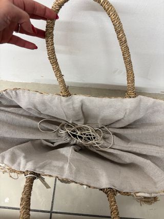 Borsa con un design unico e un manico in legno ovale. La trama del tessuto aggiunge un tocco di stile. - Manico in legno levigato. - Tessuto intrecciato con finitura paglia. - Chiusura con lacci.