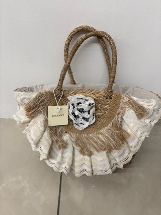 Borsa da mare in paglia con dettagli in pizzo e frange. - Materiale principale: paglia. - Decorazioni: pizzo bianco e frange. - Manici in paglia intrecciata.
