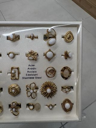 Set di 24 anelli in stile vintage, perfetti per completare ogni look. - Design assortiti con pietre bianche e dettagli dorati. - Materiale: Acciaio Inossidabile (Stainless Steel).