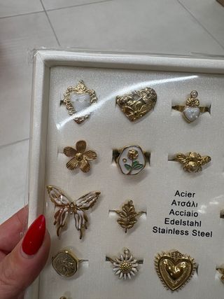 Bellissimo set di 24 anelli con design assortiti, perfetti per aggiungere un tocco di stile. - Anelli con decorazioni a forma di cuore, fiori, farfalle, libellule e altro. - Finitura dorata con dettagli in smalto bianco. - Materiale: Acciaio Inossidabile (Stainless Steel).