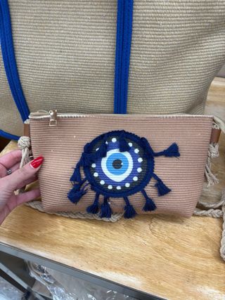 Borsa a tracolla con un design unico. - Decorazione con occhio turco ricamato. - Dettagli con nappe blu. - Zip di chiusura dorata.