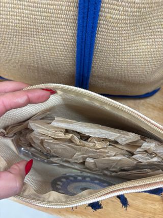 Elegante pochette con dettagli in paglia e pelle. - Materiale: paglia e pelle - Colore: beige e marrone - Chiusura a girello metallica