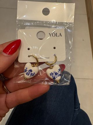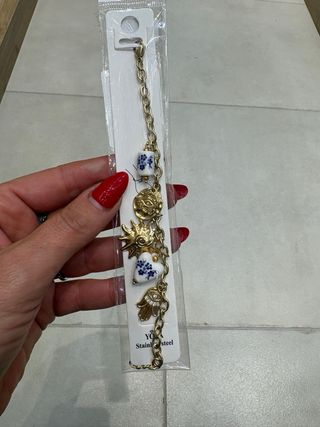 Set composto da orecchini e bracciale a forma di cuore. - Design a cuore con decorazioni floreali blu. - Dettagli dorati. - Materiale: acciaio inossidabile.