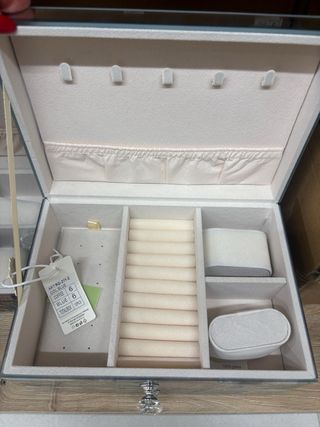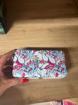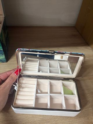 Elegante portagioie con una vivace fantasia floreale che combina tonalità di blu e rosso. Perfetto per organizzare i tuoi gioielli. - Design decorato con motivi floreali. - Chiusura a scatto.