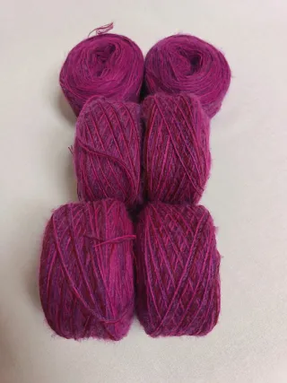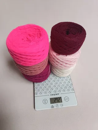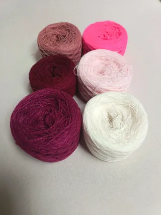 Lotti di filato misto lana in diverse tonalità. - Peso totale 272g. - Colori: fucsia, bordeaux, rosa chiaro, rosa antico, viola. - Ideale per progetti di maglia o uncinetto.