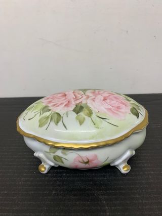 Elegante portagioie in ceramica dipinta a mano con un delicato motivo floreale. - Decorato con rose rosa e foglie verdi. - Bordatura dorata. - Base con piedini.