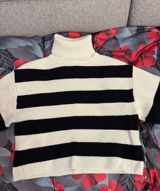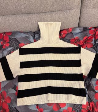 Maglione Zara a maniche corte con collo alto e fantasia a righe bianche e nere. - Fantasia a righe orizzontali. - Collo alto a costine. - Maniche corte.