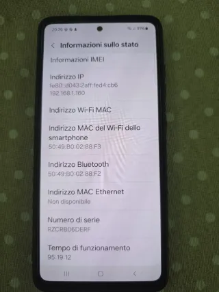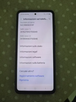 Informazioni sul telefono. - Numero di serie: RZCRB06DERF - IMEI (slot 1): 351627943793849 - IMEI (slot 2): 351868563793848 - Informazioni sullo stato - Informazioni legali - Informazioni software - Informazioni sulla batteria - Aggiornamento software - Ripristina