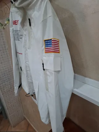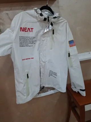 Giacca NEAT con stampa ispirata alla NASA. - Stampa NEAT sul petto. - Testo descrittivo sull'agenzia NASA. - COLD WINTER 1990 stampato. - Patch bandiera americana sulla manica. - Materiale: guscio riflettente bianco con ripstop argento. - Fodera in alluminio 3M. Nuovo mai usato .