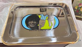 Vassoio decorativo con immagine di Maradona. - Design con Maradona El Pibe de Oro. - Bordi con finitura oro 24kt. - Materiale: metallo lucido.