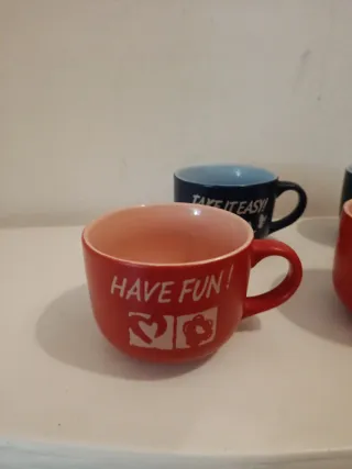 Set di quattro tazze da colazione con scritte Have Fun! e Take it easy!. - Due tazze rosse con interno color pesca. - Due tazze blu scuro con interno color pesca. - Design con scritte e decorazioni.