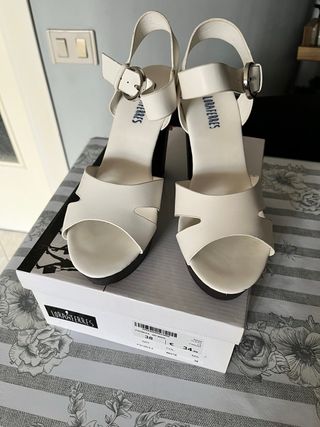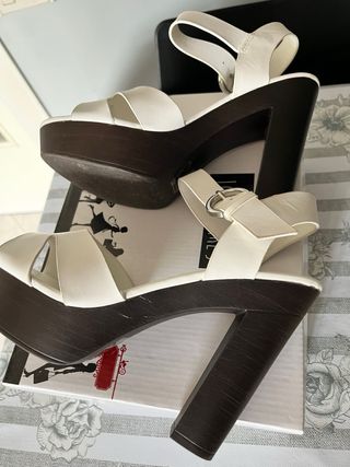 Sandali Lora Ferres con tacco, colore bianco. Indossate un paio di volte vendo causa taglia errata Tenute bene e pulite. Ottime - Design con cinturino alla caviglia e fibbia. - Tomaia con aperture decorative. - Tacco largo e plateau.