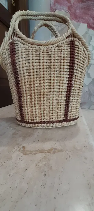Borsa in paglia intrecciata, perfetta per la spiaggia o come accessorio estivo. - Manici robusti in corda. - Dettagli a righe marroni. - Base rinforzata, fodera interna da presenta 2 piccoli buchetti e da lavare