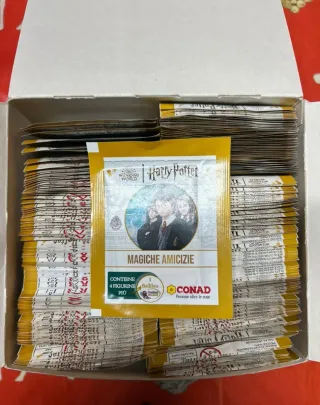 Bustine di figurine Harry Potter Magiche Amicizie. - Contiene 1 bollibro. - Ogni bustina contiene 4 figurine. - Prodotto Conad. 0,20cent. A bustina se prese in lotto uno sconto