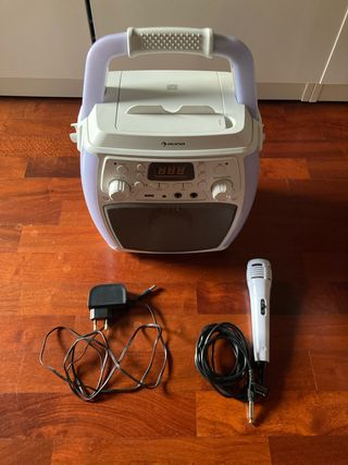 Sistema karaoke Auna completo di microfono e alimentatore, in ottime condizioni. - Microfono con cavo incluso. - Alimentatore di corrente. - Design portatile con manico.