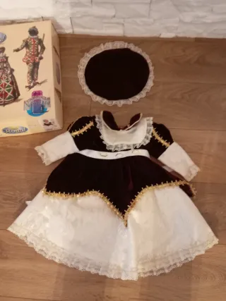 Bellissimo vestito da duchessa per il carnevale, perfetto per feste a tema. - Tessuto in velluto bordeaux. - Gonna bianca in pizzo. - Dettagli dorati sul corpetto e sull'orlo. - Include cappello abbinato.