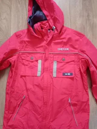 Giubbotto Geox da montagna di colore rosso. - Cappuccio integrato. - Tasche frontali con patta. - Dettagli riflettenti sulle tasche. - Coulisse sul fondo.