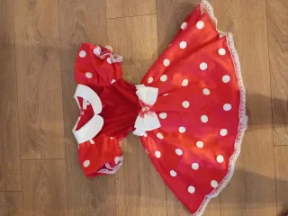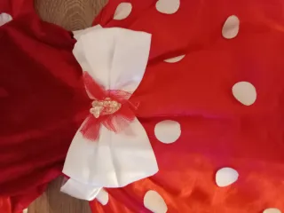 Vestito da carnevale a tema Minnie Mouse, perfetto per feste e travestimenti. - Colore rosso vivace con pois bianchi. - Dettagli in pizzo bianco sulle maniche e sul bordo. - Fiocco bianco decorativo sul davanti.