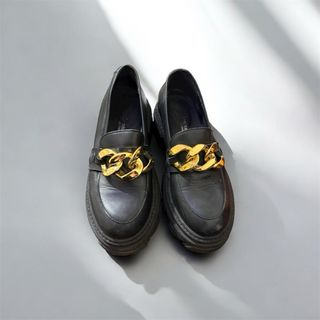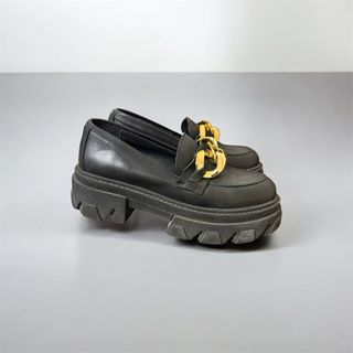 Bellissimi mocassini neri in pelle dal design chunky e super trendy, caratterizzatı da una suola a carrarmato grintosa. Il dettaglio della maxi catena dorata sul davanti li rende eleganti e moderni, perfetti da abbinare a calze a vista o pantaloni a sigaretta PREZZO TRATTABILE