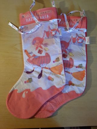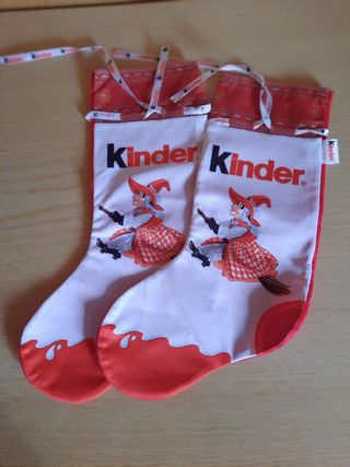 Coppia di calze natalizie a tema Kinder. In perfetto stato; lunghe circa 42 cm. - Design con strega volante e logo Kinder. - Retro rosso e dettagli a fantasia. - Nastrini in raso con logo.