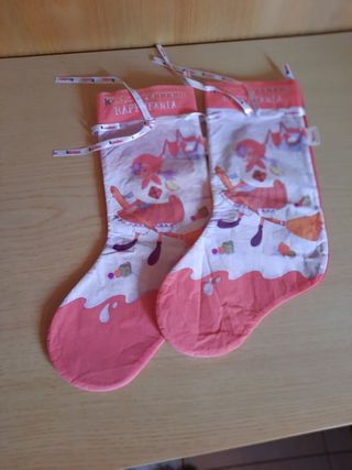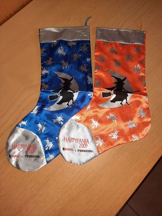 Set di 2 calze regalo uguali Kinder Ferrero. In feltro e tessuto TNT. Il colore rosa risulta un po' sbavato; rosso sul retro; lunghezza 42 cm circa. Edizione Happyfania 2010 - Fantasia con befana e scopa. - colori tenui