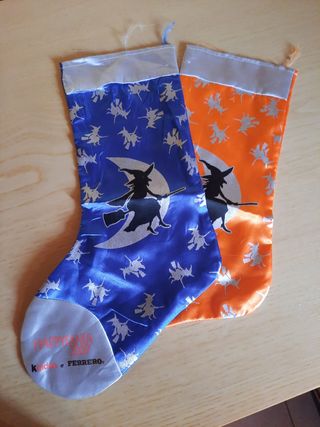 Coppia di calze originali Kinder Ferrero del 2009. - Colore blu e arancione. - Stampa di streghe volanti su scopa. - Dettaglio con logo HAPPYFANIA 2009 Kinder e Ferrero sul tallone. QUELLA BLU HA LA FASCIA SCUCITA. (guarda foto).