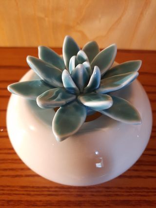 Elegante vasetto bianco, diffusore di essenze con coperchio a corolle verde; 11 cm circa di diametro/ 6 cm circa di altezza. Ha delle sigle personalizzate, sotto e su un lato. In perfetto stato. - Finitura lucida. - Design moderno.