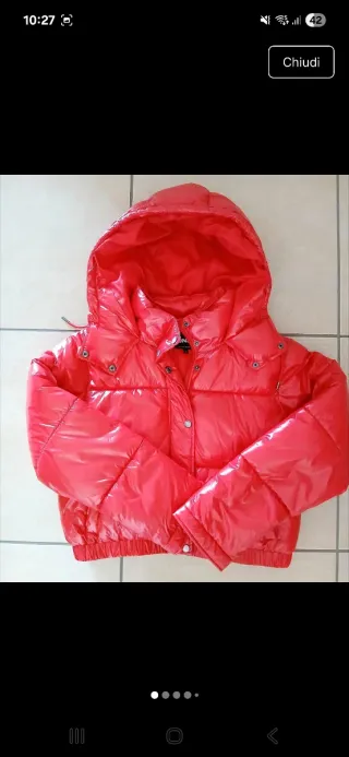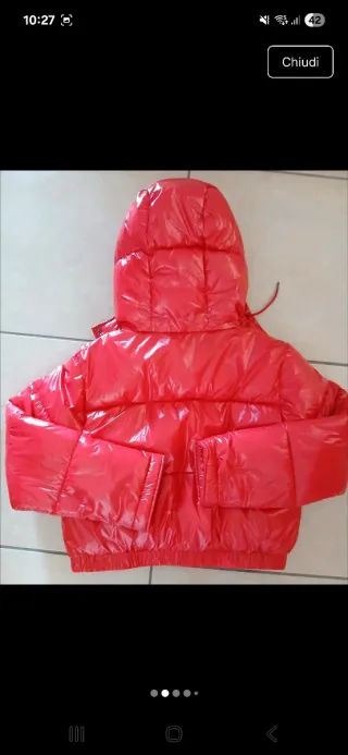 Giubbotto corto da donna con cappuccio, dal finish lucido e un vivace colore rosso. - Design imbottito. - Chiusura con bottoni a pressione. - Polsini e fondo elasticizzati.