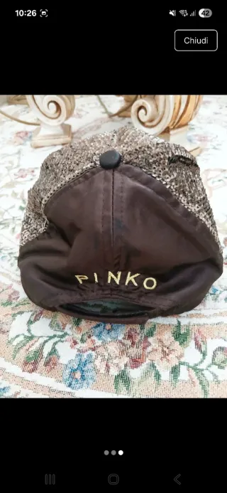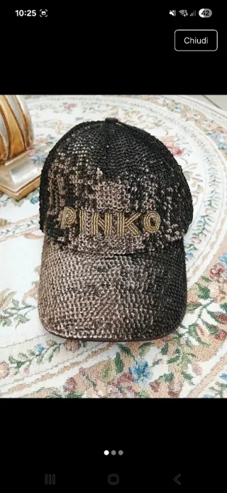 Cappello Pinko con paillettes che creano un effetto sfumato dal nero all'oro. Il logo PINKO è ricamato con perline dorate. Piccola macchia dietro - Paillettes nere e dorate. - Logo PINKO con perline.