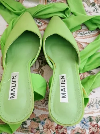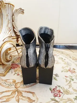 Eleganti stivaletti da donna con un design audace e scintillante. Usato pochissimo Vero cuoio - Materiale effetto laminato. - Punta aperta. - Tacco alto.