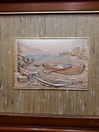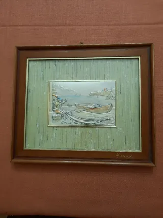 Bellissimo quadro con scena marina, firmato Moroni. In lastra d'argento 925 e dettagli colorati; passpartou beige; cornice in legno color noce e riquadri dorati. Firma Moroni incisa sulla cornice. Dimensioni totali 31,5x27 cm; dimensione della lastra 15,5×10,5 cm. In perfetto stato - Raffigurazione di un pescatore con barca e paesaggio. - Cornice in legno. - Lastra d'argento 925 con certificato di garanzia sul retro.