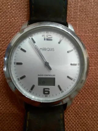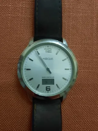 Orologio da polso Marquis con cinturino in pelle nera e cassa in argento. Il cinturino è danneggiato, da sostituire. - Quadrante bianco. - Indicatore Radio Controlled. - Cinturino in pelle da sostituire. - Cassa in metallo color argento.
