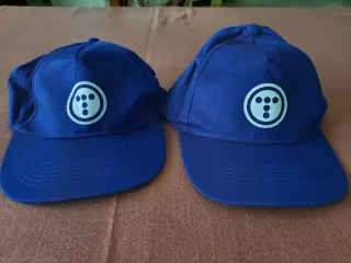 Set di due cappellini blu con un distintivo logo circolare contenente cinque pallini. Nuovi, regolabili. Per collezionisti di gadget. [di tecnogas.net] - Colore: Blu - Design: Logo circolare con pallini