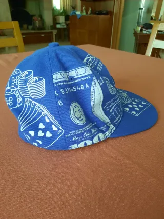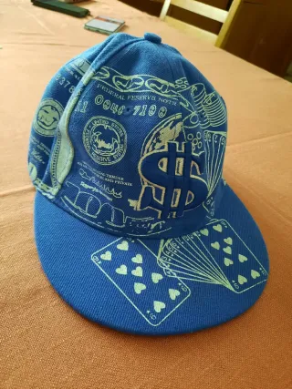 Cappellino da baseball con un design unico ispirato al denaro e alle carte da gioco. In ottimo stato. USATO, POTREBBE ESSERE LAVATO; ma è comunque in ottimo stato, senza parti consunte. - Colore blu vivace. - Grafica dettagliata con simboli del dollaro e carte. - Stampa FEDERAL RESERVE NOTR e UNITED STATES. - Elementi grafici di carte da gioco sul frontino.