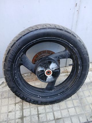 Ruota posteriore per moto Yamaha R1. Cerchio in lega nera con disco freno. - Marca pneumatico: METZELER METRONIC - Misura pneumatico: 18 - Disco freno incluso