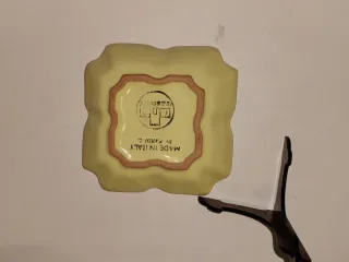 Delizioso piattino decorativo in maiolica, realizzato in Italia. Presenta un simpatico proverbio italiano, Ottimo per regalo. Prodotto dalla famosa famiglia ceramista Pardi. - Decorato a mano con fiori. - Bordo sagomato con finitura viola. - Base d'appoggio inclusa.