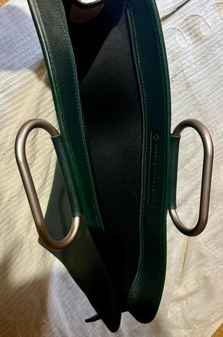 Borsa vintage in pelle di colore verde scuro. - Design elegante e raffinato. - Dettagli metallici con manici a forma di anello. - Chiusura con patta e bottone a pressione.